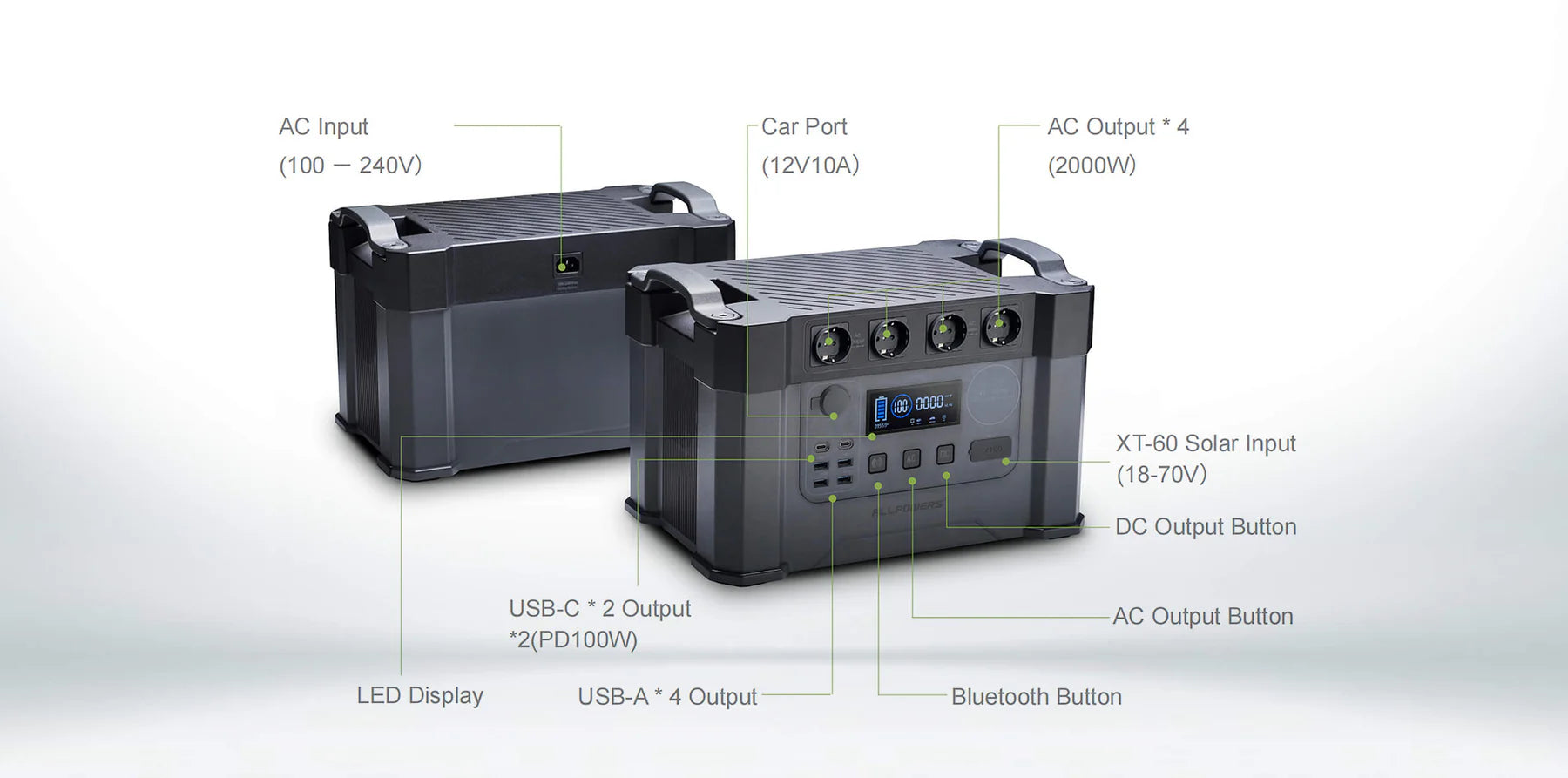 El S2000 viene con una batería de 1500 Wh y tiene 4* salidas de CA (PURE SINE WAVE, 2000 W, pico 4000 W), 2* puertos USB-C PD de 100 W, 2* puertos de carga rápida USB-A QC3.0, 2* USB estándar -Puertos A y 1* enchufe para coche.