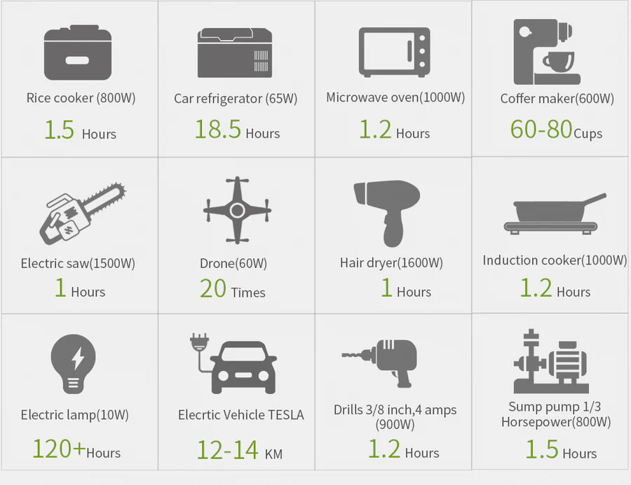 Primero, necesita saber los vatios de su dispositivo de carga, por ejemplo, 500 W. Luego, salida de CA: tiempo de trabajo = 1500 Wh * 0,85 / potencia de trabajo del dispositivo. 1500 Wh * 0,85 /500 w = 2,5 horas (calculado aproximadamente) CC Salida: tiempo de trabajo = 1500 Wh * 0,90 / potencia de trabajo del dispositivo. 1500 Wh * 0,9 / 500 w = 2,7 horas (calculado aproximadamente)