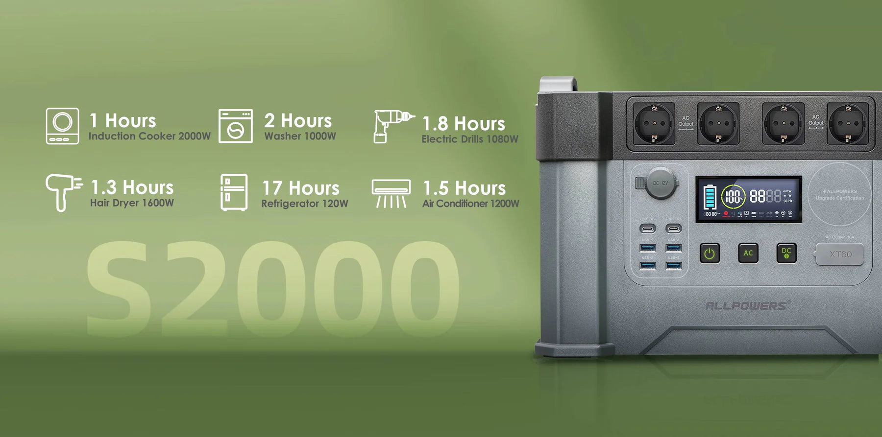 Este innovador S2000 alimenta todos sus electrodomésticos imaginables, incluidas placas eléctricas, refrigeradores grandes, aires acondicionados y más, con una enorme capacidad de carga de 1500 Wh. Todo en él es ideal, desde llevar tus impresionantes vacaciones familiares al siguiente nivel hasta aventuras fuera de la red en los entornos más inspiradores. Tienes la capacidad de hacerlo parte.