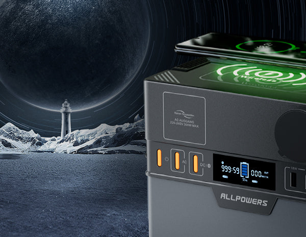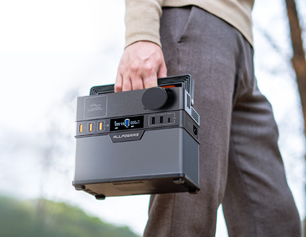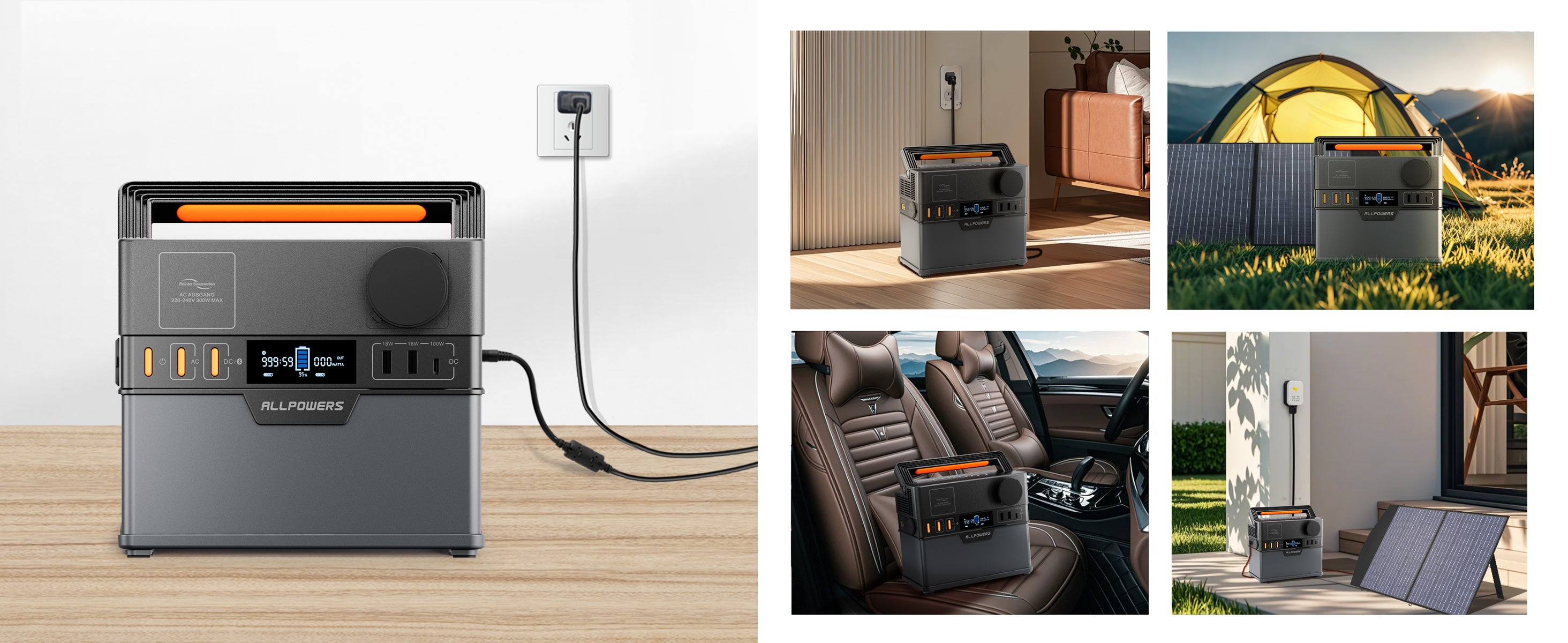 ALLPOWERS Portable Power tiene 4 formas de cargar la batería de emergencia. Se necesitan 1,5 horas para cargar por completo la estación de energía portátil utilizando un enchufe de pared de 230 V CA; aproximadamente 3-4 horas utilizando un panel solar bajo la luz solar directa (100 W máx.); aproximadamente 3-4 horas utilizando un enchufe de encendedor de automóvil de 12 V/24 V; aproximadamente 1 hora utilizando la carga de CA y los paneles solares juntos (300 W máx.).