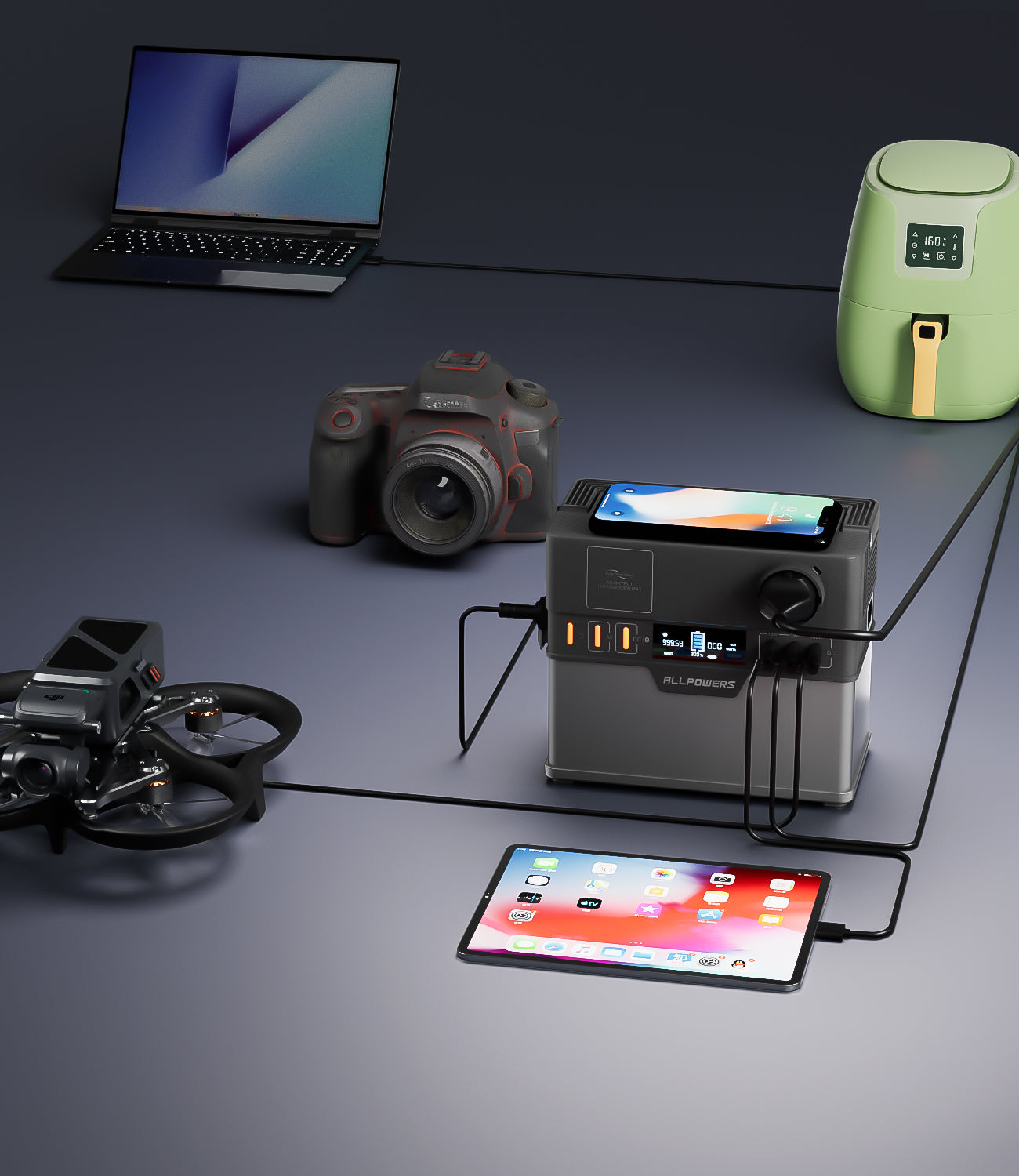 La estación de energía portátil ALLPOWERS S300 Plus está equipada con un paquete de baterías de 288 vatios-hora. La fuente de energía portátil cuenta con 1 puerto de CA (220 V-240 V), 300 W (pico de 600 W), 2 puertos USB-A, 1 puerto USB-C, 1 toma para encendedor de cigarrillos (12 V/8,5 A) y un cargador inalámbrico (5 V/1 A) en la parte superior. La estación de energía portátil Allpowers te brinda los puertos que necesitas para cargar todos tus dispositivos al mismo tiempo.