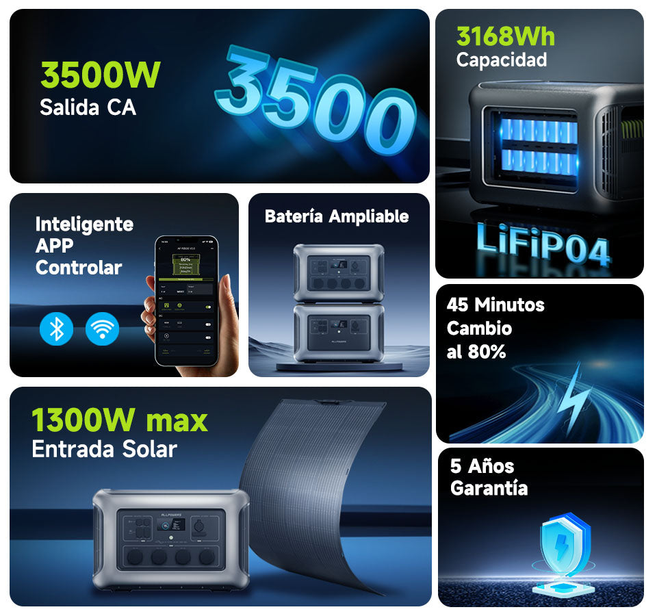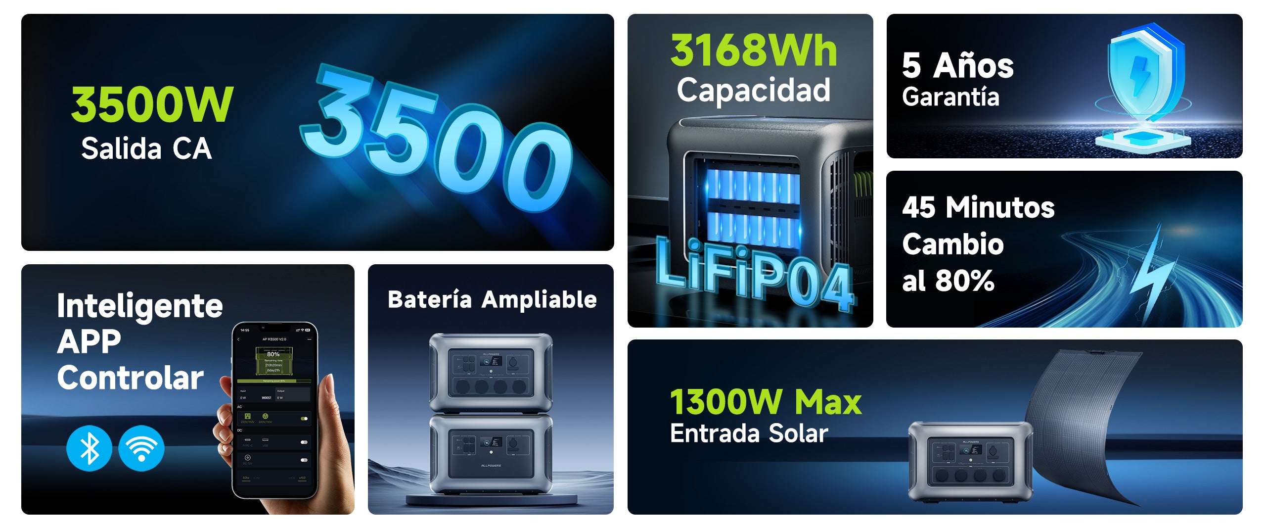- Batería LiFeP04 de larga duración con más de 3500 ciclos de carga;