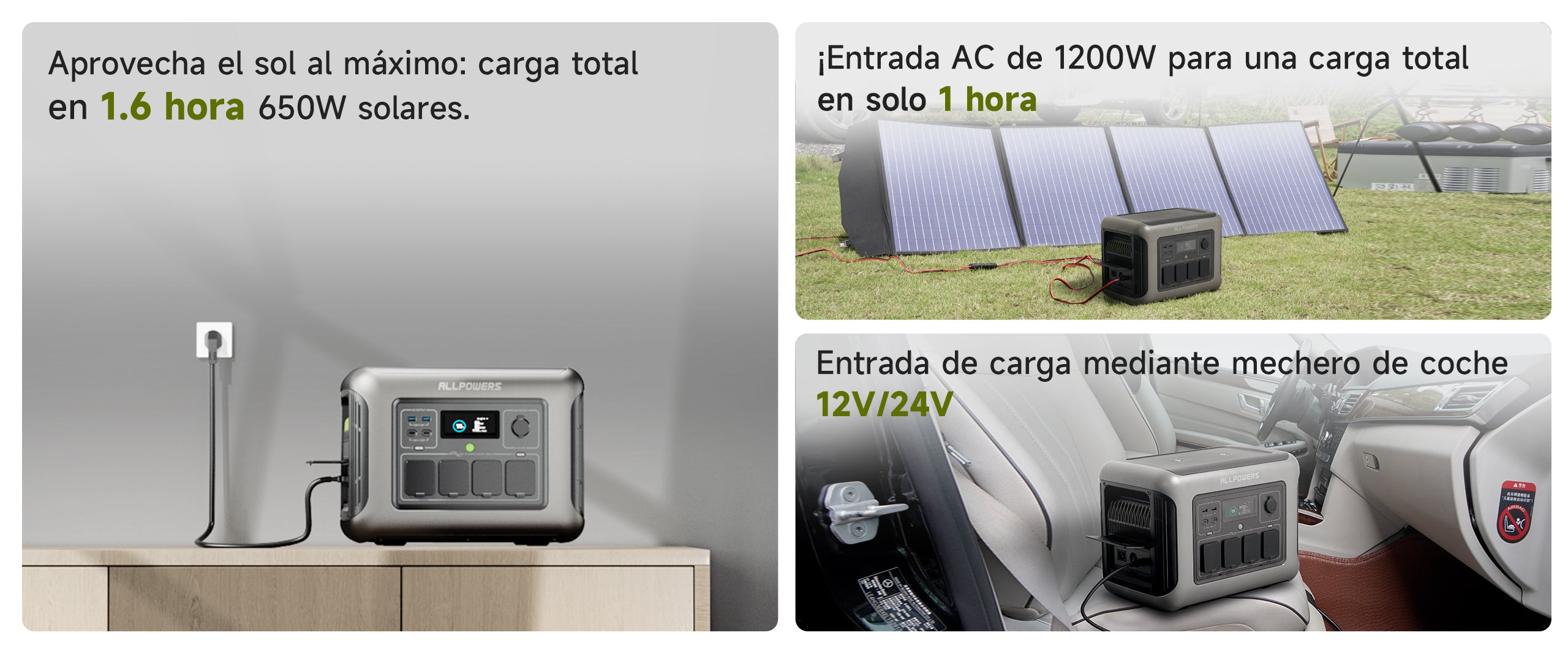 recarga completa del 0 al 100 % en solo 60 minutos (entrada máxima 1200W) con toma de corriente;