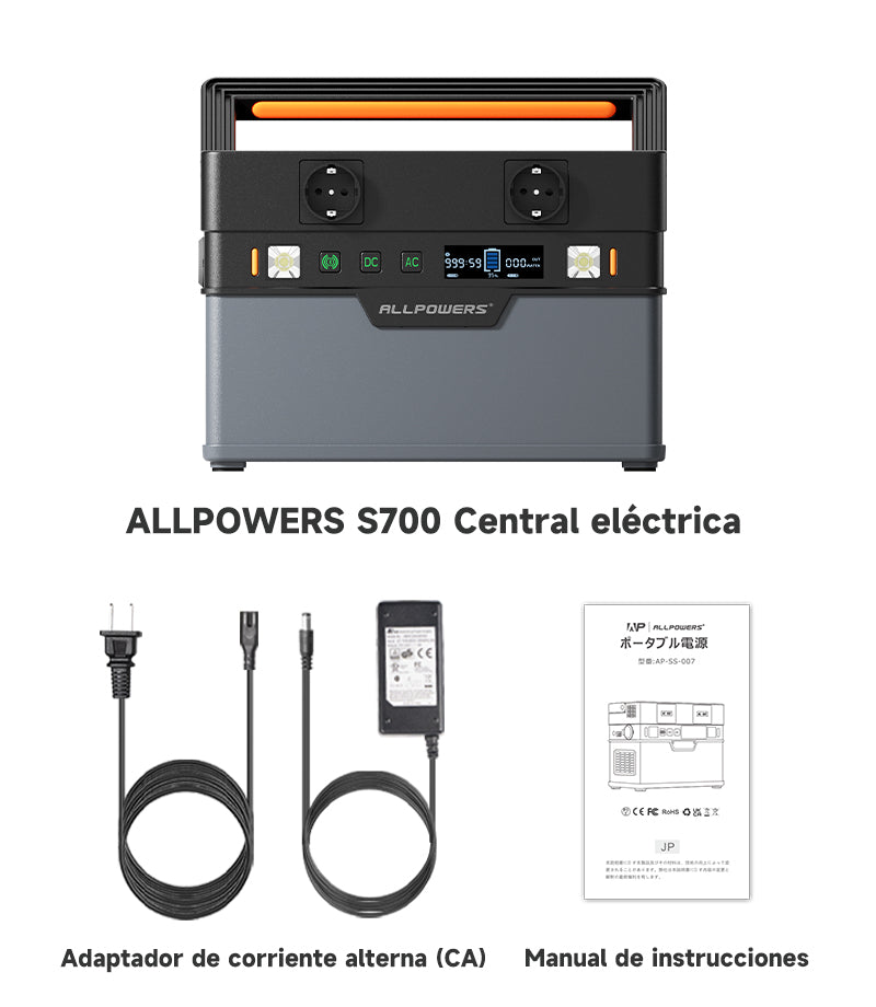 Tenga en cuenta que el puerto de salida de CA solo puede cargar/alimentar dispositivos que funcionen a menos de 700 vatios. Una vez superado, el S700 se apagará automáticamente. Consulte las especificaciones de su dispositivo antes de comprarlo.