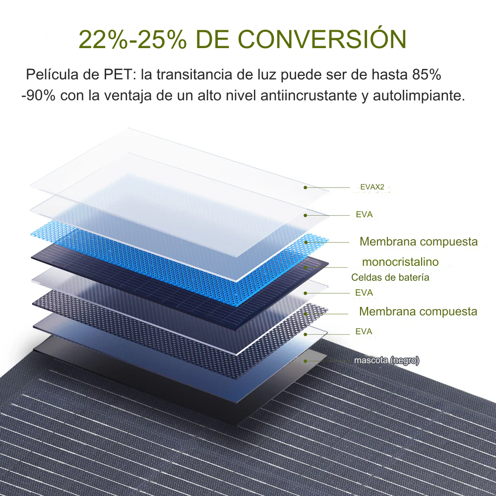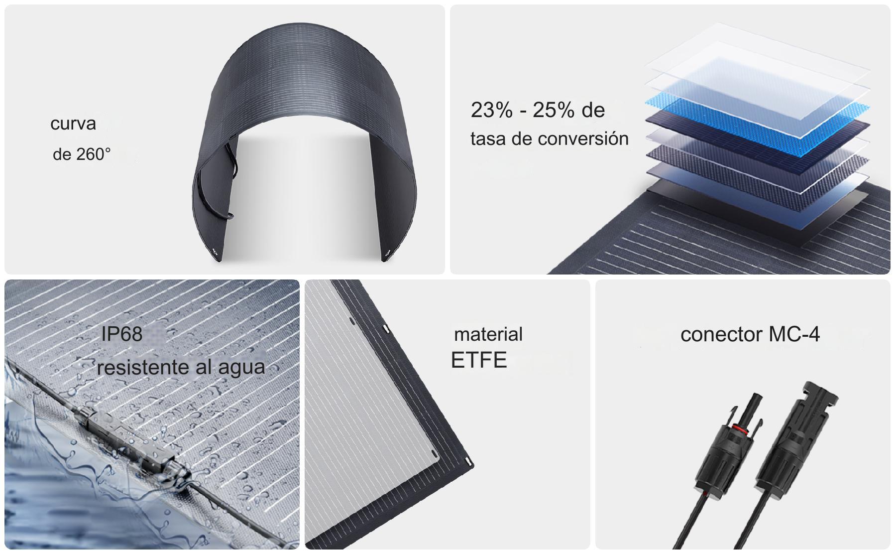 El panel solar flexible ALLPOWERS SF100 está fabricado con células solares monocristalinas, cuya tasa de conversión puede alcanzar el 22% -25%. Se utiliza ETFE en forma de panal en la superficie y las irregularidades forman refracción para recoger la luz solar desde diferentes ángulos. Junto con el puerto conector solar con una pérdida mínima, puede obtener más potencia al mismo tiempo. Excelente opción para vehículos recreativos, techos, casas rodantes, remolques, botes, cabañas, cobertizos, tiendas de campaña y yates.