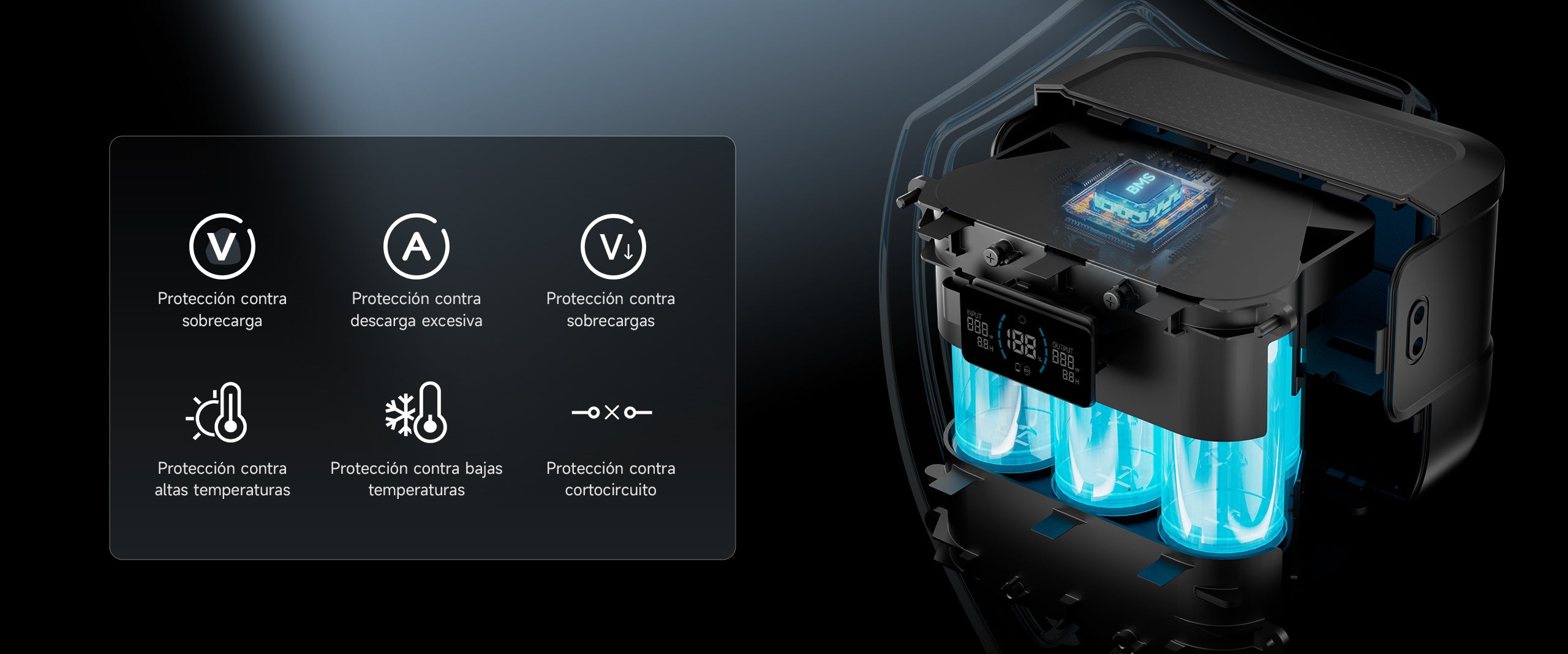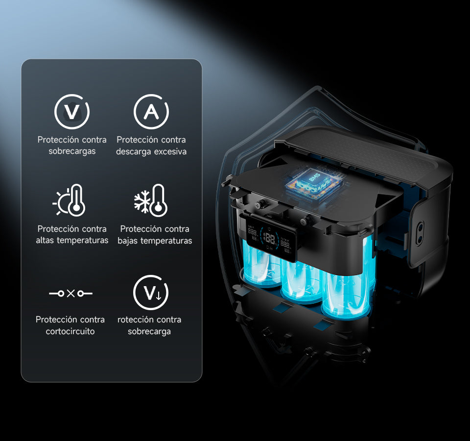 Con ALLPOWERS SOLAX P100, tu seguridad está asegurada. Su sistema BMS avanzado protege contra sobrecarga, descarga excesiva, cortocircuito y sobrecalentamiento. Energía segura, siempre.