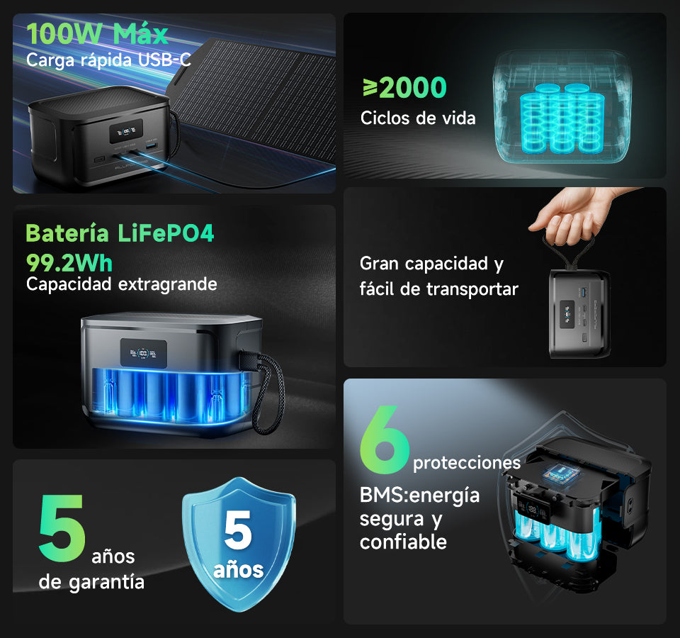 El ALLPOWERS SOLAX P100 es la solución definitiva en energía portátil, con una capacidad de 31000mAh(99.2Wh) en un diseño compacto y fácil de transportar. Ya sea que estés acampando sin conexión a la red eléctrica, trabajando de forma remota o preparándote para emergencias, esta potente fuente de energía mantendrá tus dispositivos esenciales cargados.