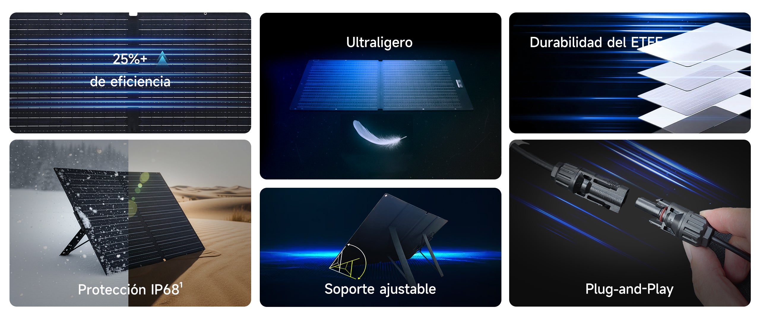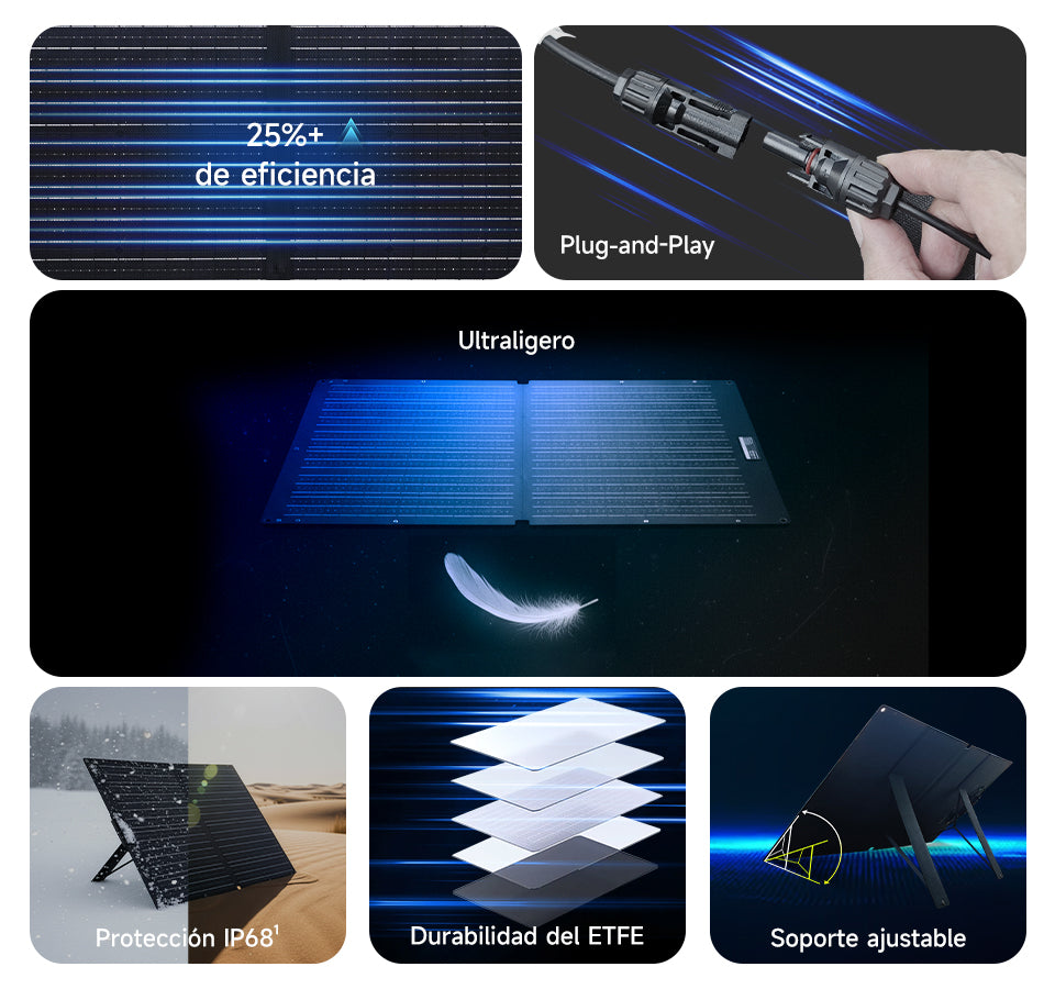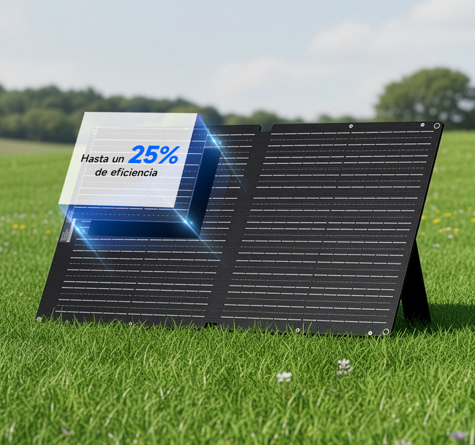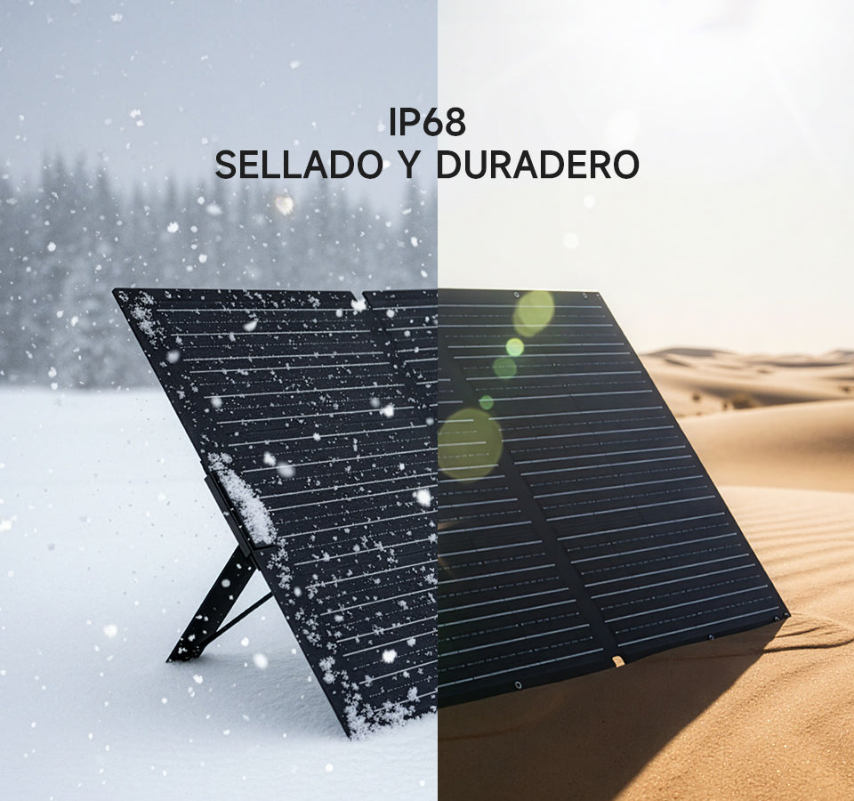 Su certificación IP68 (la más alta contra agua y polvo) garantiza un funcionamiento estable en cualquier clima. Con una tasa de conversión del 25%, líder en el sector, carga tus dispositivos más rápido incluso con poca luz.