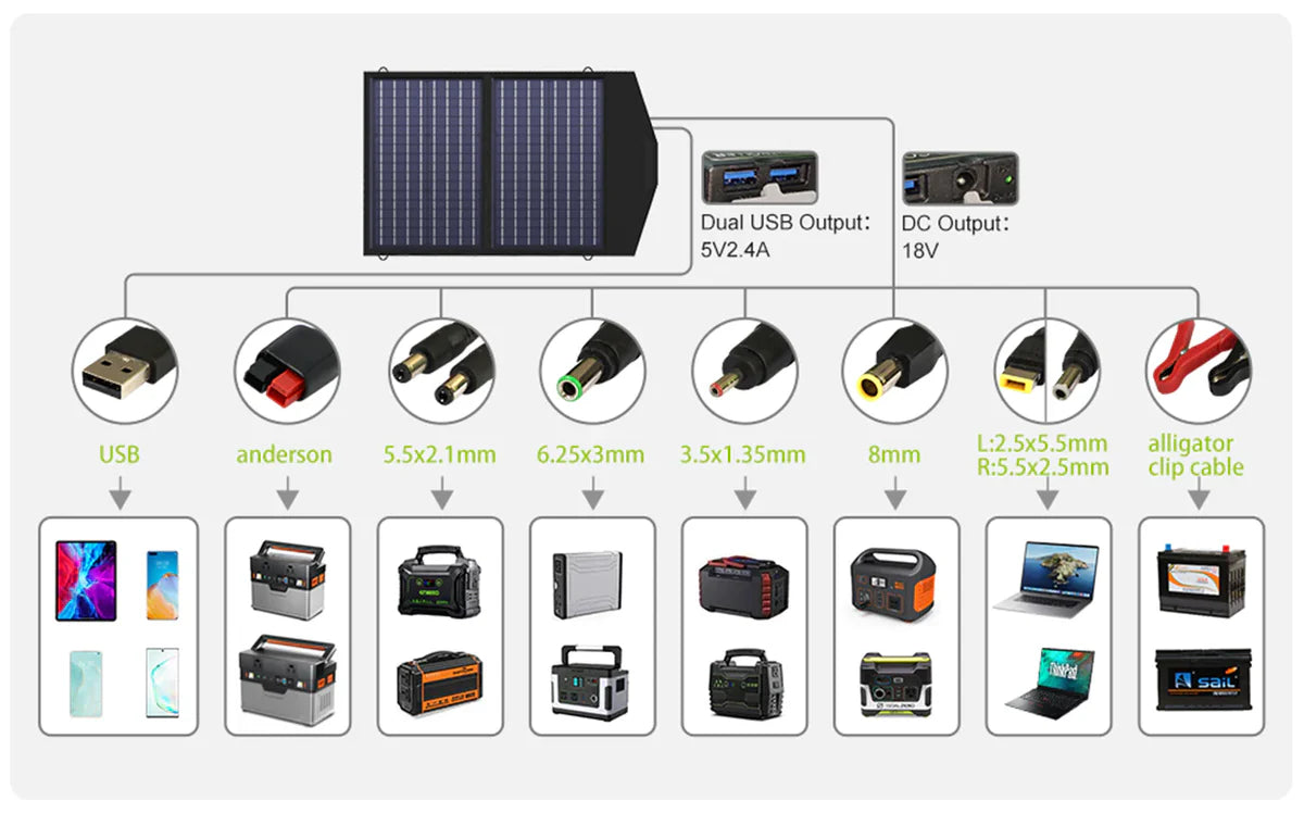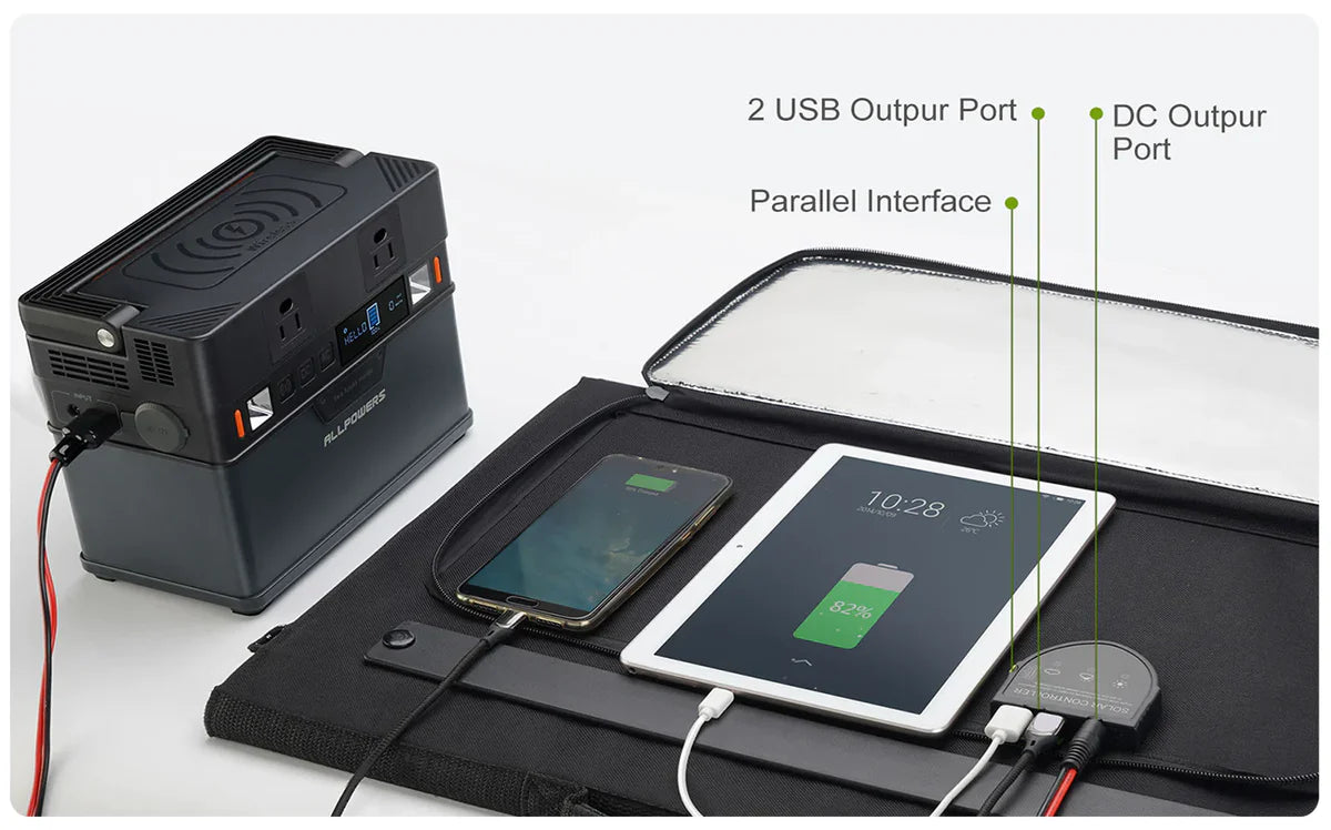 Equipado con una salida USB dual, el panel solar de 60 W es altamente compatible con teléfonos, iPads, centrales eléctricas portátiles ALLPOWERS S200 y otros dispositivos.