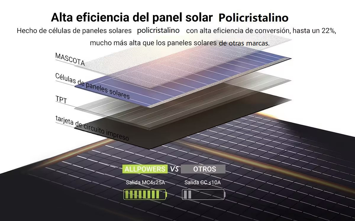 El kit de panel solar portátil ALLPOWERS de 100 W está fabricado en los EE. UU., con hasta un 22 % de eficiencia, 1/3 más ligero que la misma potencia del silicio solar. La potencia total aumentó en 1/3 en comparación con el mismo tamaño del kit de paneles solares portátiles.