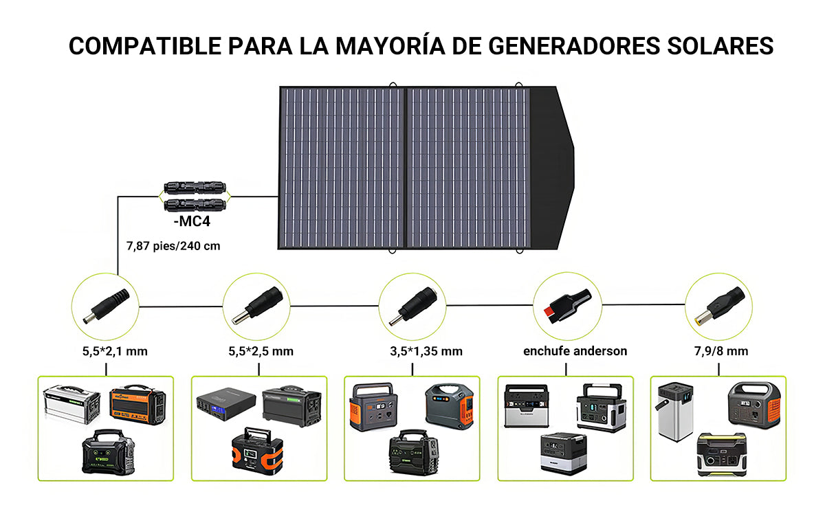 El panel solar plegable ALLPOWERS de 100 W es compatible con la mayoría de los generadores solares/centrales eléctricas portátiles del mercado. El kit de panel solar portátil incluye diferentes tamaños de conectores para generador portátil (conector solar a Anderson/conector solar a DC)