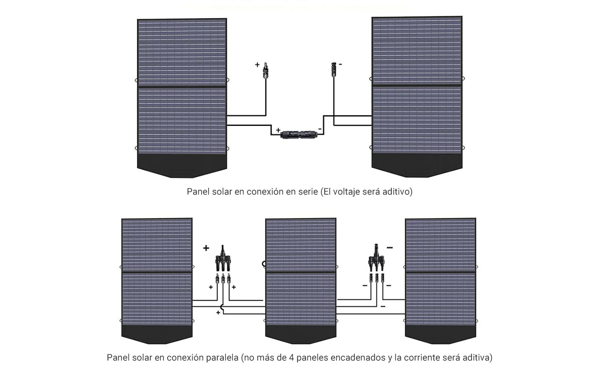 Al conectar varios paneles solares en paralelo o en serie, puede obtener mayor potencia y voltaje.