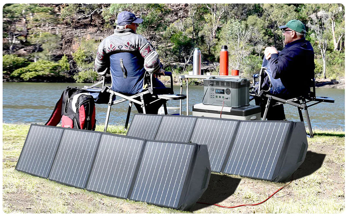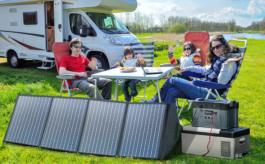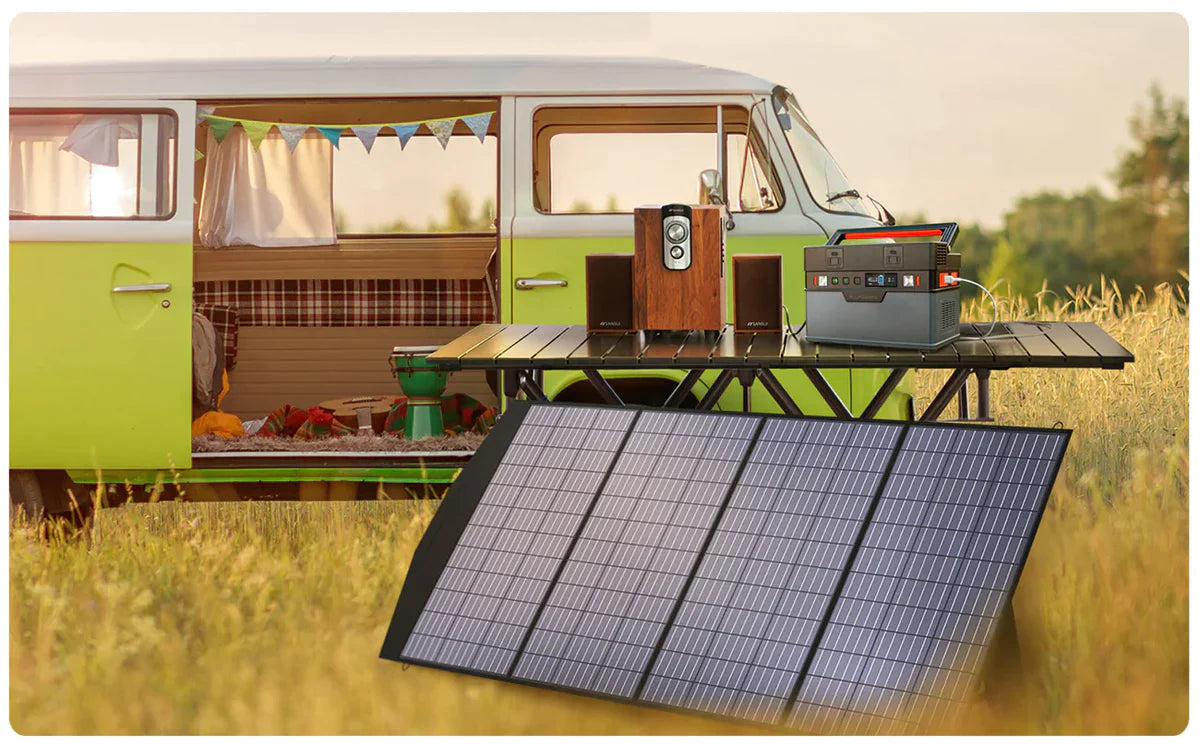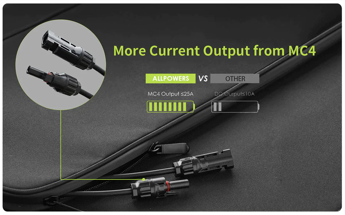 Panel solar portátil ALLPOWERS de 200W con hasta un 22% de eficiencia y 1/3 más ligero que la misma potencia del silicio solar. La salida de 200 W puede proporcionar más energía a sus dispositivos y cargarlos más rápido.