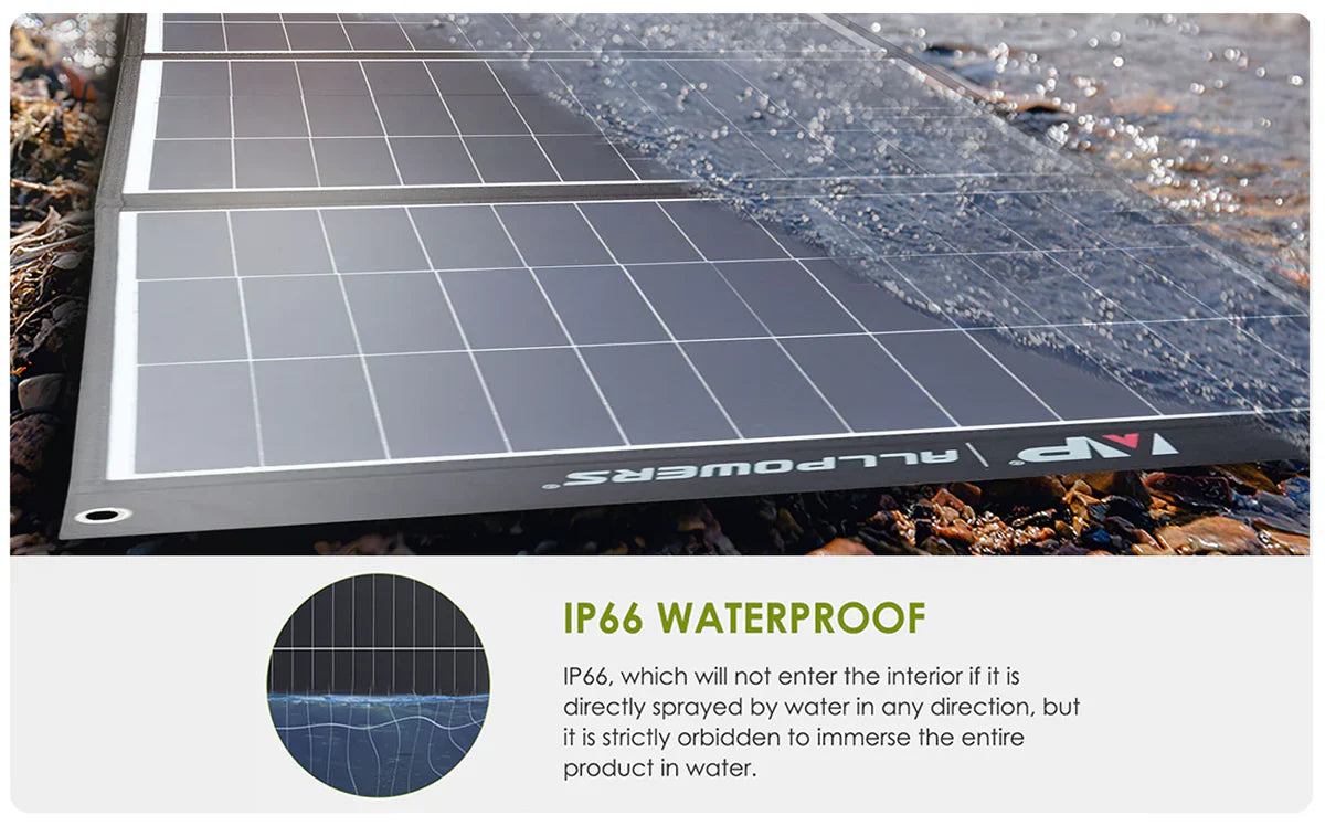 Fabricado con tecnología laminada avanzada y material ETFE duradero en la superficie, el cargador solar plegable Allpowers de 200 W es más duradero y resistente a los arañazos. Es resistente al agua IP66 que protegerá de chorros de agua a alta presión desde cualquier dirección.